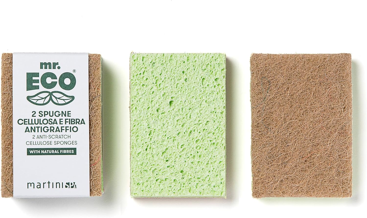 martini SPA – Mr Eco – Esponja Doble acción, celulosa y Fibra antiarañazos, Color Verde y marrón, 10 x 7 x 2 cm, 32 g, 2 Unidades – Made in Italy –