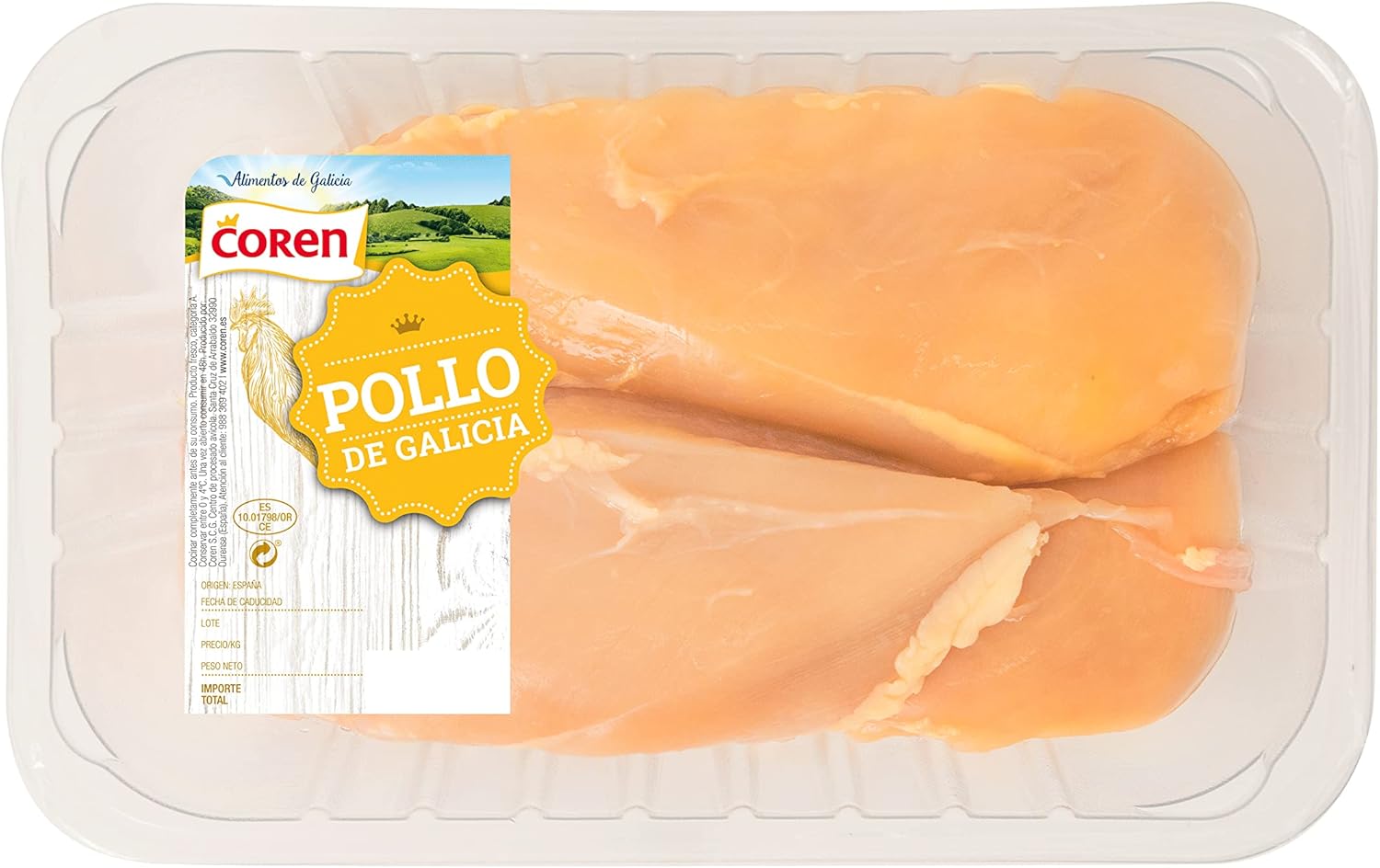 Pechuga de pollo en bandeja termosellada en atmósfera protectora. En gallinero en condiciones de máximo bienestar animal. Alimentación de 65% cereales con predominancia de trigo y maíz. Coloración amarilla. La característica culinaria es la jugosidad y trazabilidad. Control integral del proceso desde las madres reproductoras hasta el sacrificio. Nacido y criado en Galicia por granjeros Coren.