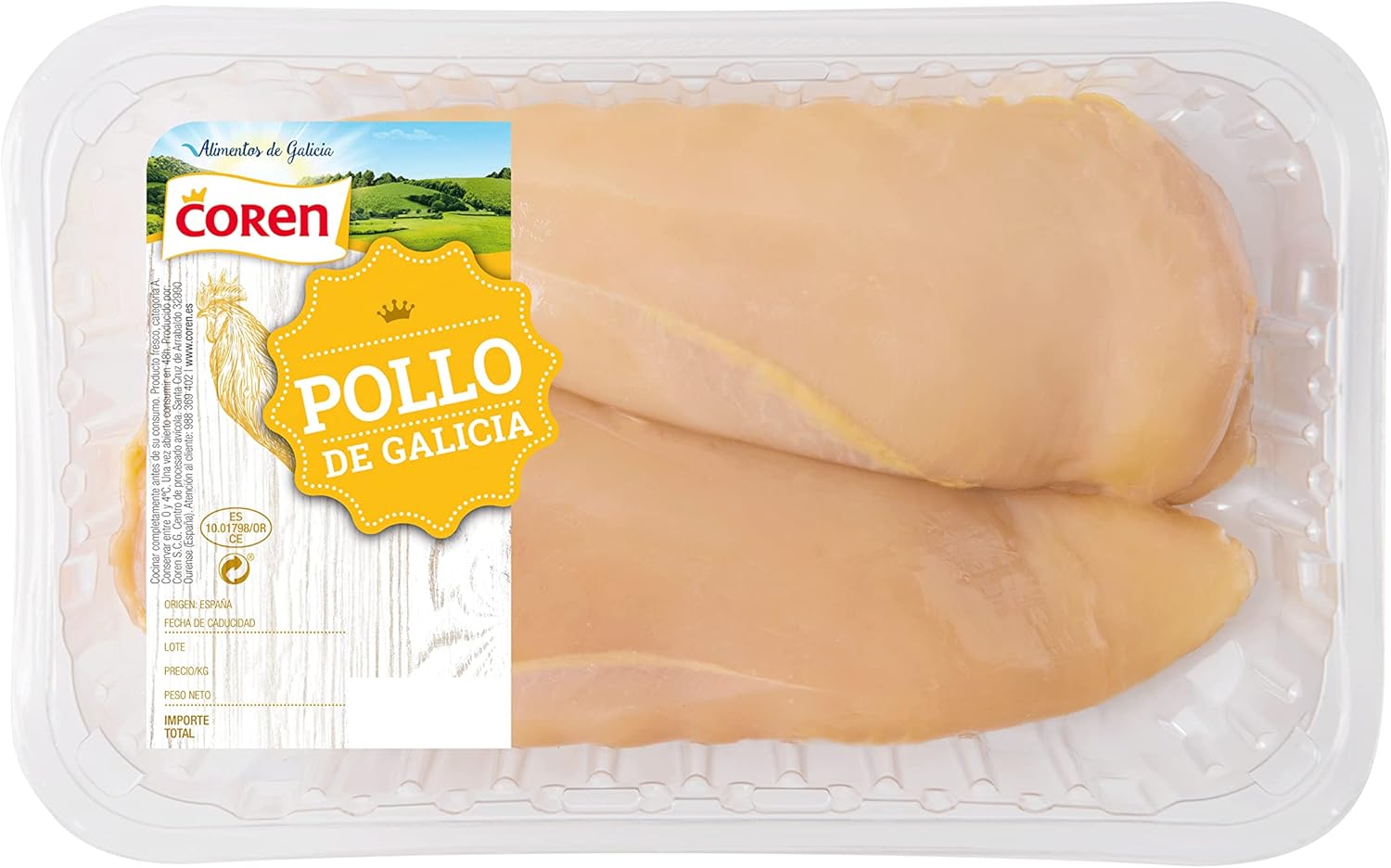 Pechuga de pollo en bandeja termosellada en atmósfera protectora. En gallinero en condiciones de máximo bienestar animal. Alimentación de 65% cereales con predominancia de trigo y maíz. La característica culinaria es la jugosidad y trazabilidad. Control integral del proceso desde las madres reproductoras hasta el sacrificio. Nacido y criado en Galicia por granjeros Coren.