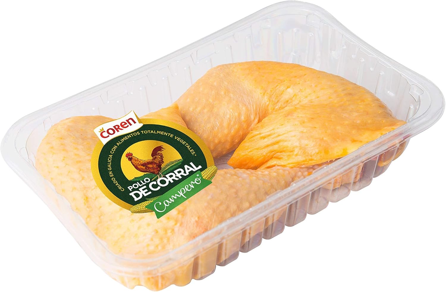 Longaniza de pollo de Coren en bandeja termosellada en atmósfera prtectora, sin gluten, lactosa, colorantes o conservantes. Cada bandeja contiene entre 6 y 7 salchichas. Salida libre a campo gallego con un espacio mínimo de 1 m2 por animal. Alimentación 100% vegetal (50% maíz). Característica culinaria: sabor y trazabilidad. Control integral del proceso desde las madres reproductoras hasta el sacrificio. Nacido y criado en Galicia por granjeros Coren. Ingredientes