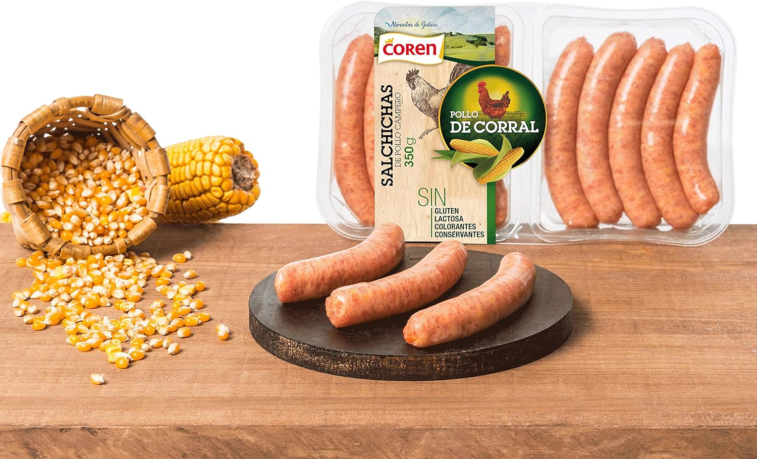 Preparado de carne picada de pollo de corral, especias y aditivos autorizados embutidos en tripa natural. Salchichas de pollo campero sin gluten, lactosa o conservantes. Cada bandeja contiene entre 6 y 7 salchichas. Salida libre a campo gallego con un espacio mínimo de 1 m2 por animal. Alimentación 100% vegetal (50% maíz). Característica culinaria: sabor y trazabilidad. Control integral del proceso desde las madres reproductoras hasta el sacrificio. Nacido y criado en Galicia por granjeros Coren. Ingredientes