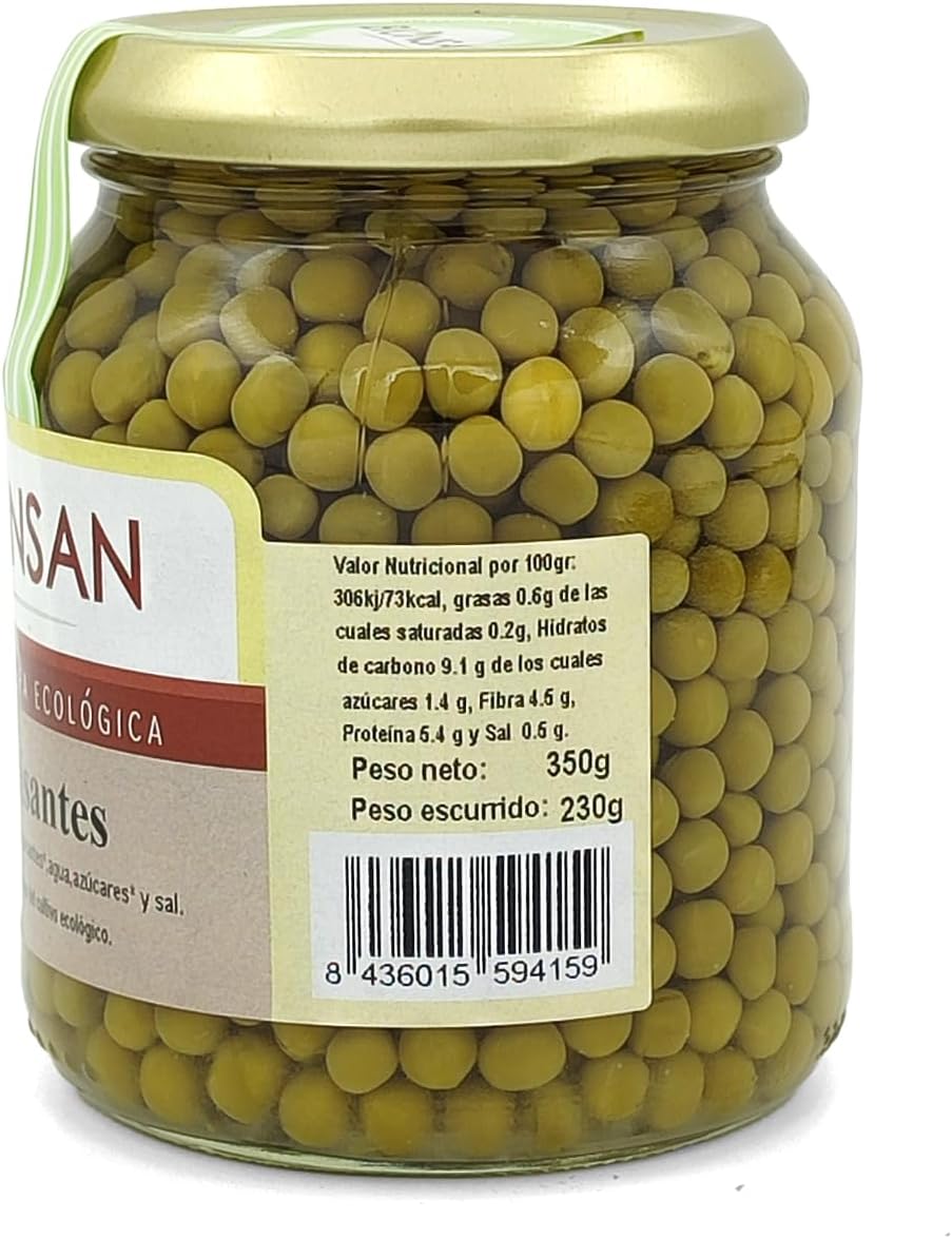 PROPIEDADES: los guisantes en conserva ecológicos son una excelente fuente de proteína vegetal. Si además los combinamos con algún cereal (avena, espelta, etc.) tenemos una proteína vegetal completa de buena calidad, algo especialmente beneficioso para las personas que siguen una dieta vegana o vegetariana. El contenido en grasa es prácticamente nulo. Son una buena fuente de minerales como el potasio, el fósforo, magnesio, calcio, sodio, hierro, zinc y selenio. Y también es destacable el contenido en vitaminas como vitamina C, niacina o B3, folato o B9, tiamina o B1, piridoxina o B6 y vitamina A. También aportan fibra, que es indispensable para muchas funciones que se llevan a cabo en nuestro organismo, para mantener una buena salud. PREPARACIÓN: los guisantes en conserva ecológicos están listos para ser consumidos, solo hace falta calentarlos. Ideales acompañados de arroz o salteados con verduras. INGREDIENTES: guisantes*, agua, azúcares* y sal. *Procedente de cultivo ecológico. Puede contener miel. INFORMACIÓN NUTRICIONAL (100gr): Energía: 145KJ/34Kcal, Proteína: 2.6g., Grasa: 0g. De las cuales saturadas: 0g. Hidratos de carbono: 4.4g. De los cuales azúcares: 2.3g., Fibra: 3.2g., Sal: 0.34g. ORIGEN: UE.