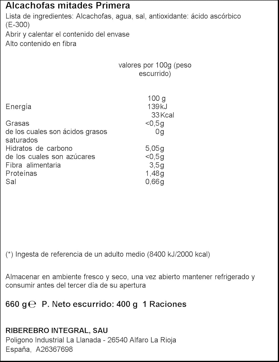 Alcachofas, Agua, Sal, Antioxidante: Ácido Ascórbico (E-300) Ver más