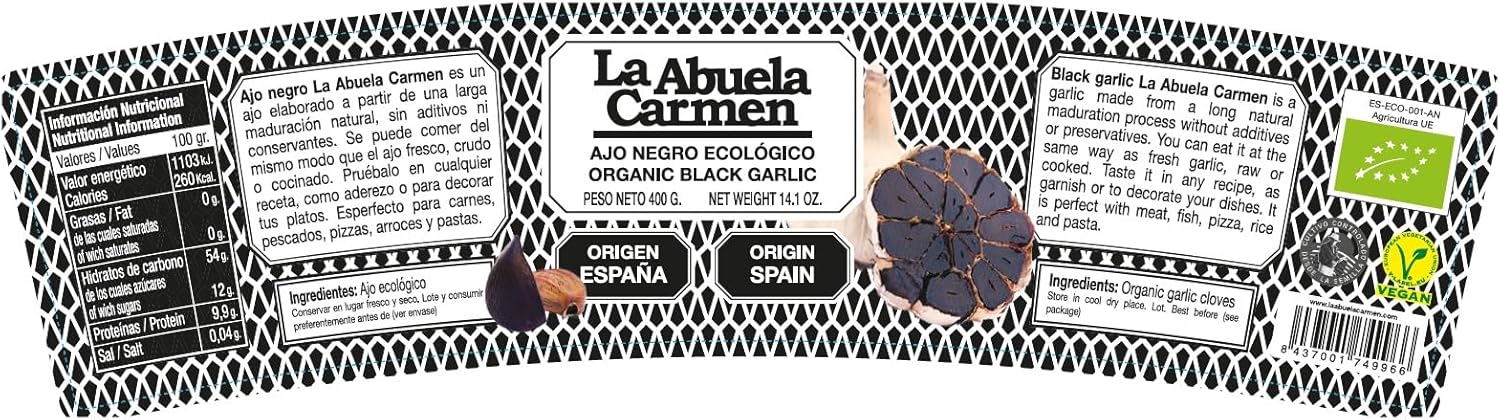 Ajo negro ecológico tarrina de dientes pelados 60gr. Elaborado con ajo morado ecológico, se obtiene mediante un largo proceso de maduración natural que combina temperatura y humedad controlada, sin ningún otro ingrediente ni conservante. Este proceso de fermentación multiplica las ya valiosas propiedades del ajo fresco. Sin gluten, sin azúcar y apto para veganos. Excelentes cualidades diuréticas, depurativas, antisépticas y antibacterianas. No solo es demandado como alimento saludable, actualmente se está convirtiendo en un ingrediente de moda en alta cocina y cocina creativa por su sabor genuino que se relaciona con el ‘Umami’, el famoso quinto sabor junto a los conocidos dulce, salado, ácido y amargo. El término Umami procede del japonés. Se deriva de los vocablos Umai (delicioso) y mi (sabor) para referirse a los alimentos que tienen un sabor delicioso, pronunciado e intenso. El ajo negro se consume solo o como ingrediente en multitud de recetas. Combina perfectamente con mariscos, quesos, carnes y hongos. Ingredientes